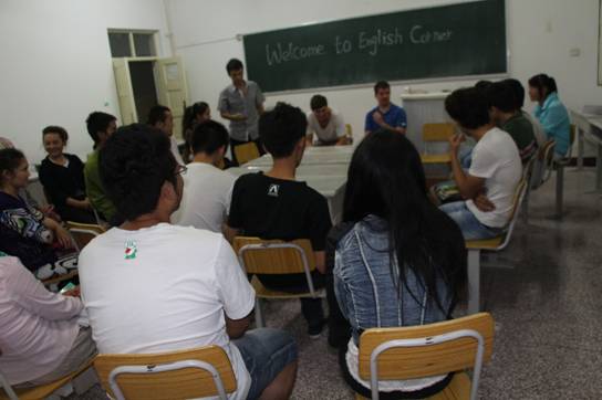 2013年9月13日星期五晚上09:30,第8期英语角在2号楼212举行。记者从英语角负责人刘雨萍处了解到,为了更好地促进外教与学生间的互动交流,新学期英语角从原1号楼309教室换到2号楼212。由于新教室桌椅可以移动,更多学生可以更近距离与外教们交流。
