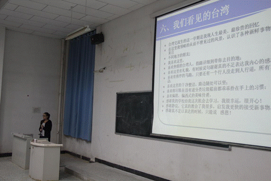 3月25日晚,2013年秋季班赴台交换生经验交流会暨2014年秋季班招生宣传在综合教学楼阶教一举行。化学工程与工艺15-1班唐菲菲、国贸15-1班杨宇航等5名赴台交换生与大家分享了他们在宝岛台湾的学习生活之旅。对外交流合作处老师,人文学院、生命科学学院和经济管理学院近150名学生,参加了本次活动。食品质量15-1班权夏丽同学受邀主持本次活动。