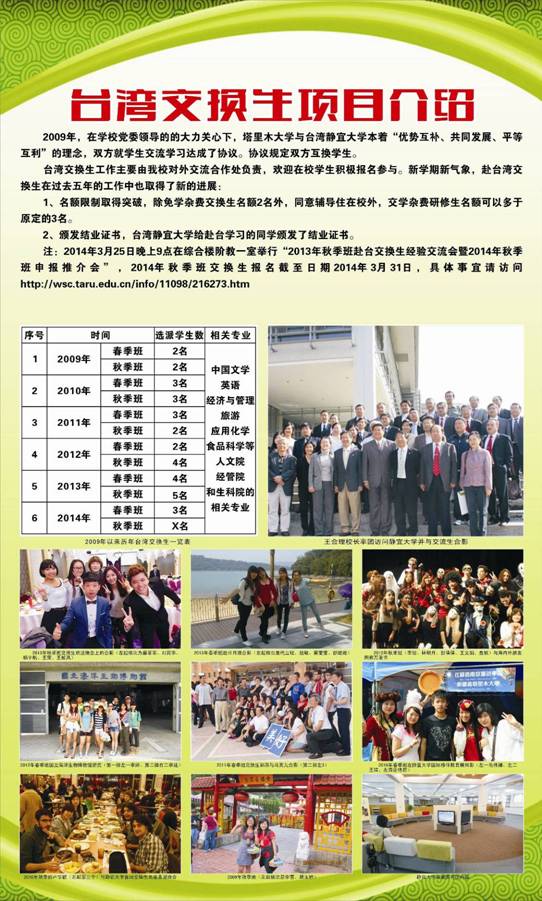 根据本次选拔工作要求,学校对外交流合作处精心设计宣传展板,用以展示近年来我校台湾交换生工作开展以来取得的丰硕成果。据悉,4月2日,对外交流合作处将组织相关老师对学院推荐初选通过学生进行面试,3个学院有意向报名的同学,可以向学院学生办公室进行咨询报名。